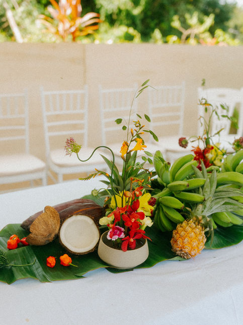 A tropical wonderland themed wedding ceremony showcasing local fruit and vegetables and tropical blooms to match.